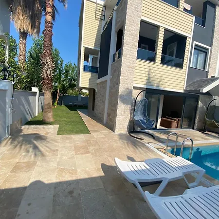 Situat la 10 minute călătorie de Parcul tematic The Land of Legends, Villa Pars Antalya Three Story Villa, Private Pool And Roof Terrace Three Bedroom Accommodation For Six Guests Belek cu 2 dormitoare, invită oaspeții să se relaxeze pe un patio.